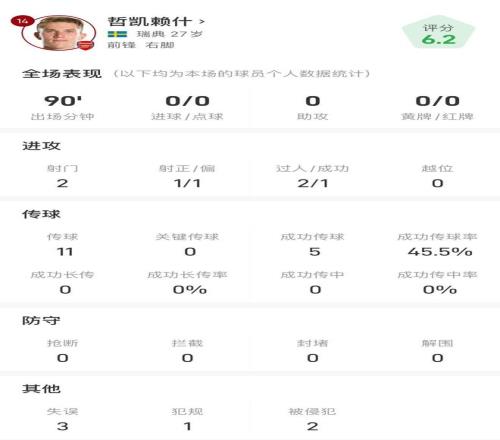 哲凱賴什vs西漢姆聯(lián)數(shù)據(jù):2射1正,傳球成功率45.5%