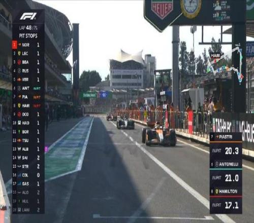 第四十八圈:安東內(nèi)利、皮亞斯特里和漢密爾頓同時進(jìn)站,邁凱倫賽車率先出站在維修區(qū)完成超越