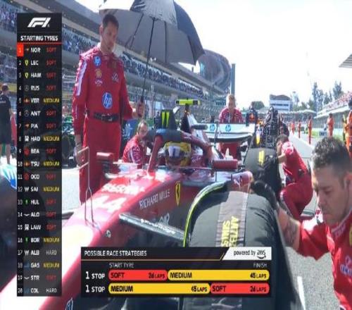 起步輪胎方面:維斯塔潘、哈賈爾、角田裕毅、塞恩斯、博托萊托和加斯利用中性胎起步,阿爾本和科拉平托使用硬胎,其他車手都是軟胎。