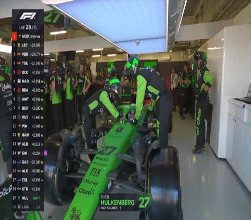 第二十八圈:塞恩斯因在維修區(qū)超速被罰時5秒,霍肯伯格賽車出現(xiàn)問題直接選擇退賽