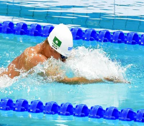 澳門泳手周文顥混合4x100游第二棒蛙泳接力,與隊(duì)友一起把澳門紀(jì)錄推快2秒05。