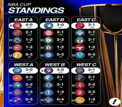 先給你們看看NBA杯的小組最新戰(zhàn)績排名情況