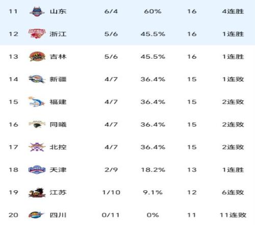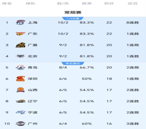 前十一輪過后,廣廈隊(duì)、上海隊(duì)、北京隊(duì)、廣東隊(duì)分列積分榜前四名,巧合的是,以上四隊(duì)的戰(zhàn)績(jī)都是9勝2負(fù)。