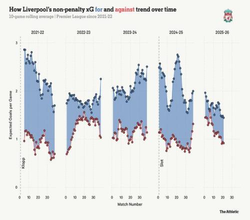 利物浦的預(yù)期進(jìn)球數(shù)(xG)數(shù)據(jù)(包括進(jìn)球和丟球)進(jìn)一步反映了這一點(diǎn),他們創(chuàng)造機(jī)會的質(zhì)量(基于10場比賽的滾動平均值)呈現(xiàn)明顯的下降趨勢,這與他們在令人擔(dān)憂的丟球數(shù)之后需要在防守端解決的問題(紅線所示)相吻合。