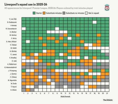 本賽季,有4名球員在進(jìn)攻三區(qū)的觸球率達(dá)到或超過10%:加克波、索博、維爾茨和薩拉赫,分擔(dān)進(jìn)攻重任固然值得肯定,但誰應(yīng)該承擔(dān)更多責(zé)任卻存在不確定性,這種缺乏協(xié)調(diào)性的問題正在顯現(xiàn)。