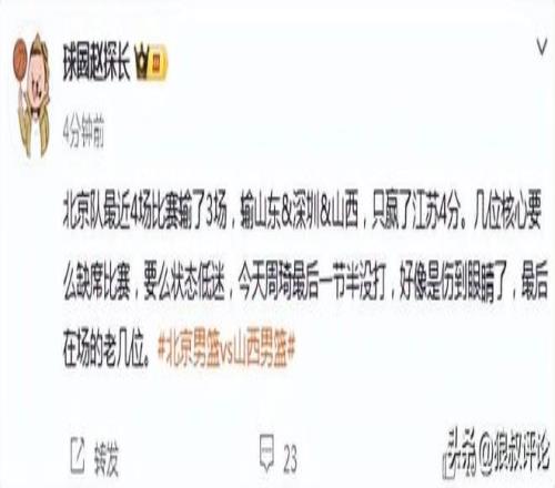 北京隊最近4場比賽輸了3場,輸山東&深圳&山西,只贏了江蘇4分。幾位核心要么缺席比賽,要么狀態(tài)低迷,今天周琦最后一節(jié)半沒打,好像是傷到眼睛了,最后在場的老幾位。
