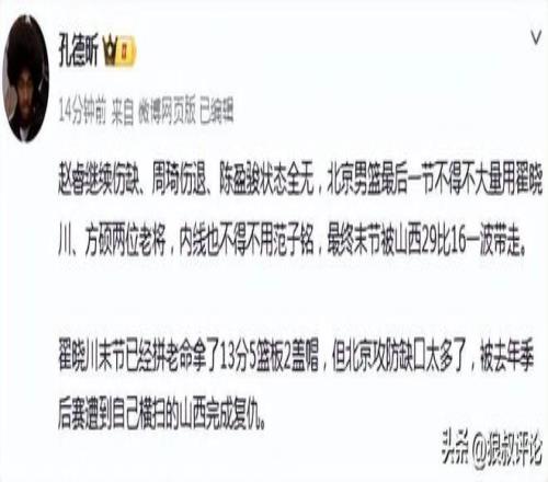 翟曉川末節(jié)已經(jīng)拼老命拿了13分5籃板2蓋帽,但北京攻防缺口太多了,被去年季后賽遭到自己橫掃的山西完成復(fù)仇。