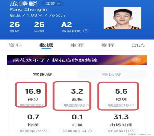 龐崢麟加盟CBA首秀,就砍下16分3籃板6助攻,而且全場0失誤。截止目前,龐崢麟代表江蘇隊(duì)打了15場比賽,在場均31分鐘上場時(shí)間里,為球隊(duì)貢獻(xiàn)16.9分3.2籃板5.6助攻。其個(gè)人場均得分,排在全聯(lián)盟第22位,個(gè)人場均助攻,排在全聯(lián)盟第10位。