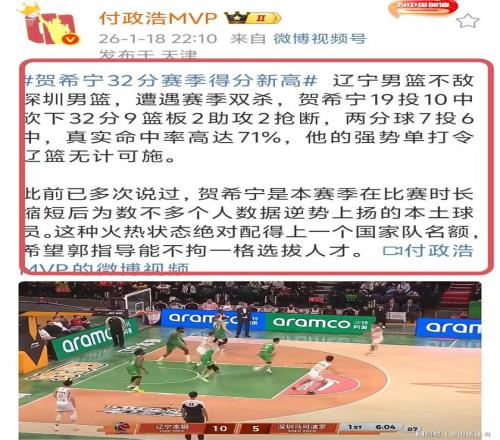 賽后,著名媒體人付政浩發(fā)文,對(duì)賀西寧的表現(xiàn)大加贊揚(yáng)“遼寧男籃不敵深圳男籃,遭遇賽季雙殺,賀希寧19投10中砍下32分9籃板2助攻2搶斷,兩分球7投6中,真實(shí)命中率高達(dá)71%,他的強(qiáng)勢(shì)單打令遼籃無計(jì)可施。此前已多次說過,賀希寧是本賽季在比賽時(shí)長縮短后為數(shù)不多個(gè)人數(shù)據(jù)逆勢(shì)上揚(yáng)的本土球員。這種火熱狀態(tài)絕對(duì)配得上一個(gè)國家隊(duì)名額,希望郭指導(dǎo)能不拘一格選拔人才。"。